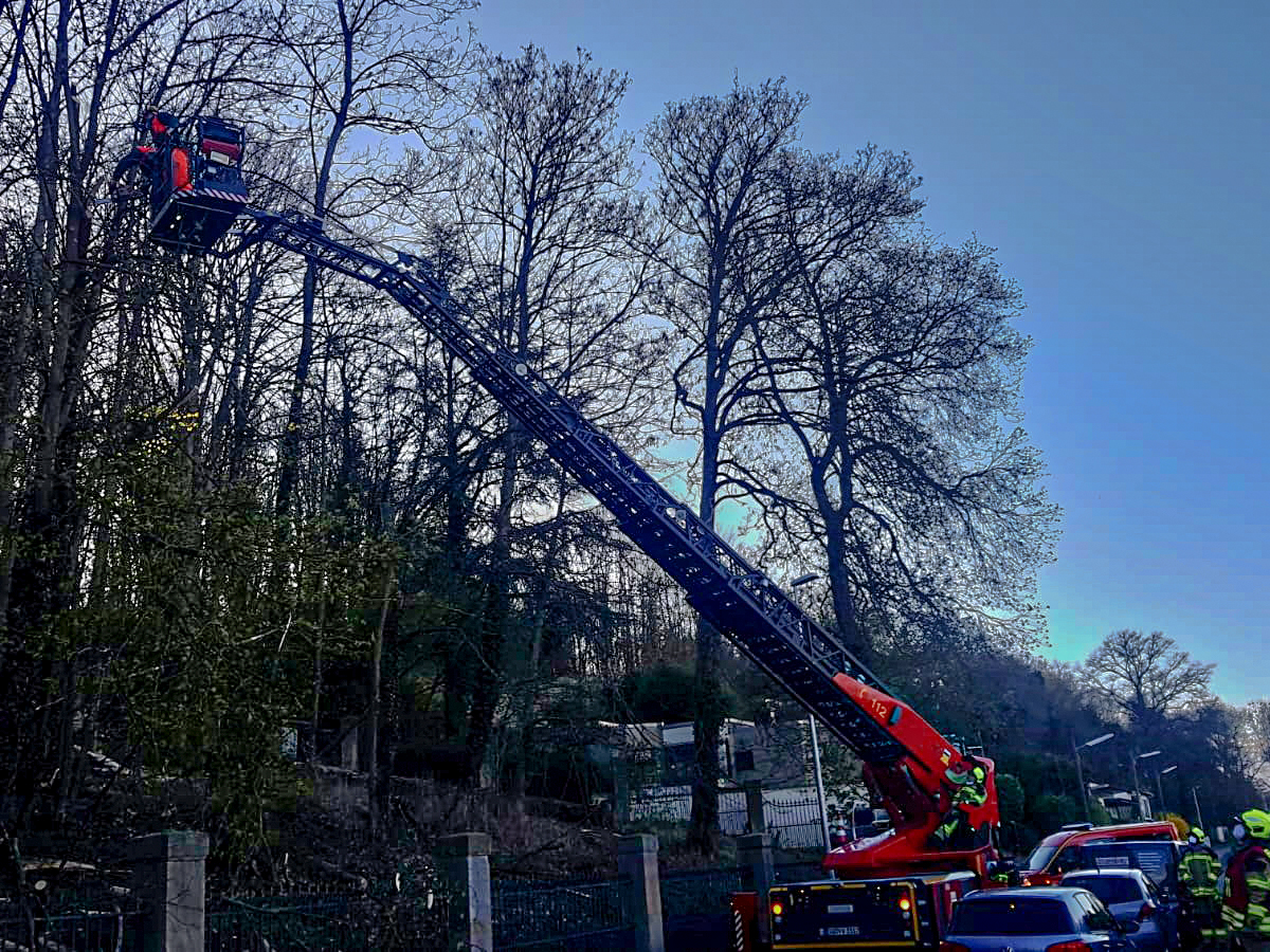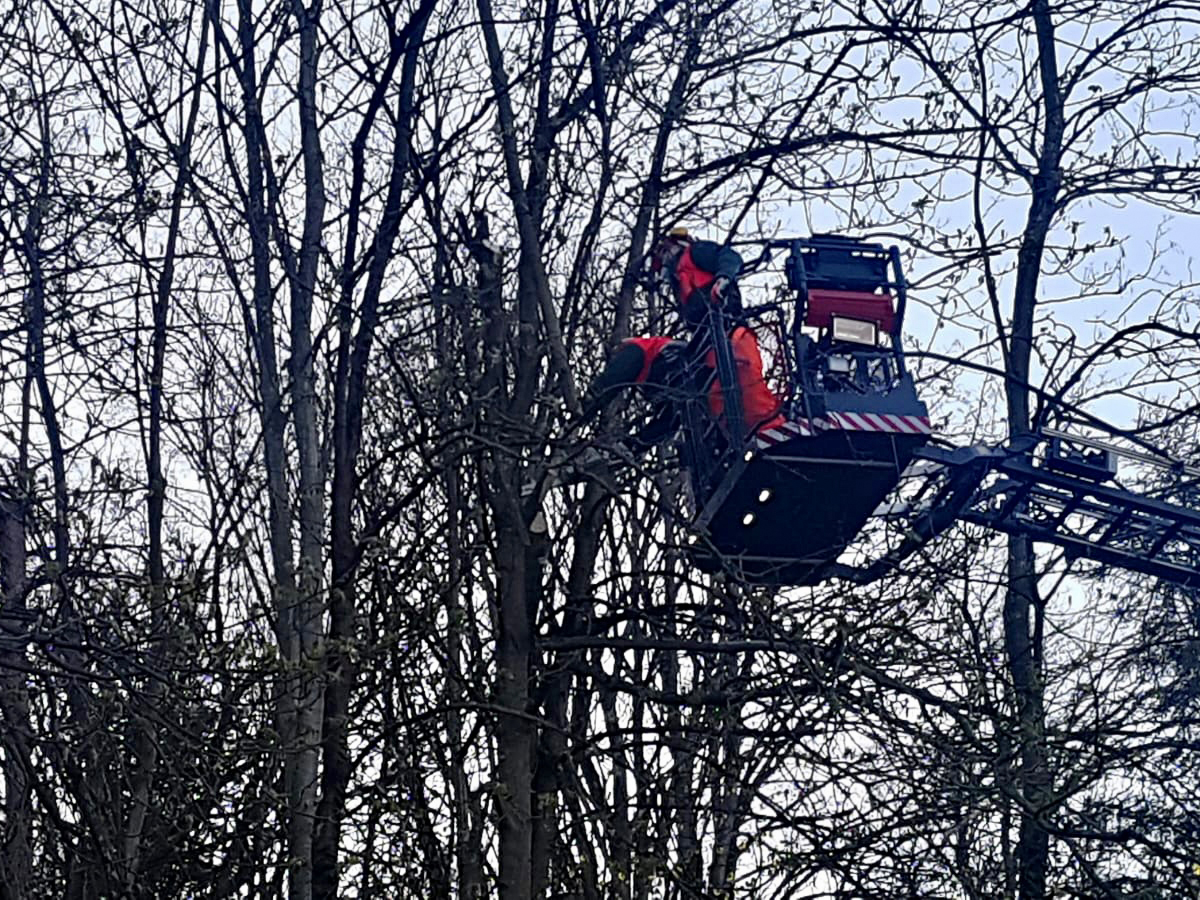 Vor Ort wurde die Einsatzstelle abgesperrt und der Baum über die Drehleiter Stück für Stück abgesägt, sowie lose Äste aus den anderen Bäumen entfernt.