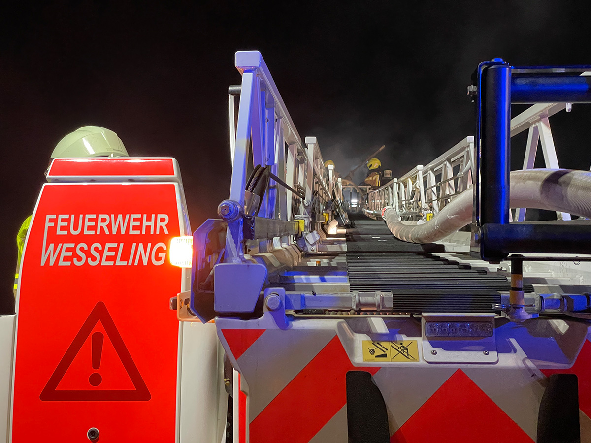 Mit der Drehleiter wurde die Dachhaut von einem Trupp unter Atemschutz geöffnet und abgelöscht. Da es sich hier um einen zeit- und arbeitsintensiven Aufwand handelte, wurde eine zweite Drehleiter aus Wesseling eingesetzt.