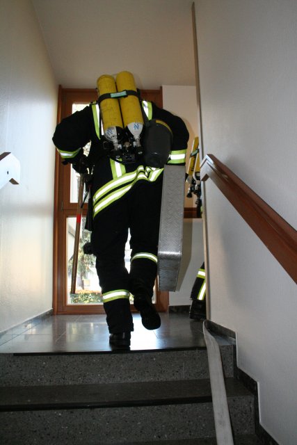 Ein Angriffstrupps, ausgerüstet mit Atemschutz und einem C-Hohlstrahlrohr, ging zur Menschenrettung über das Treppenhaus in die Wohnung vor. Ein weiterer Angriffstrupp, ebenfalls mit Atemschutz und C-Hohlstrahlrohr ausgerüstet, ging zur Rettung der Person auf dem Balkon über die Drehleiter vor.Im Anschluss an die Übung war die Feuerwehr vom Wohnstift Beethoven zu einer aufwärmenden Erbsensuppe eingeladen.