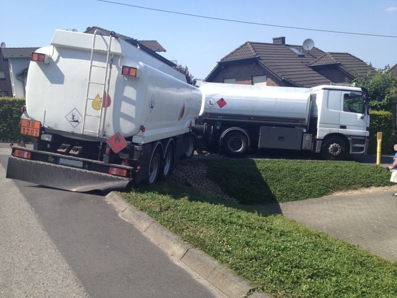 Am Montag, den 08. Juli wurde die Feuerwehr in den Heideweg Ecke Lenaustraße gerufen. Dort hatte ein Tanklastzug der Heizöl liefern wollte versucht zu wenden und war mit dem Anhänger gefährlich nahe an einen Abhang geraten.