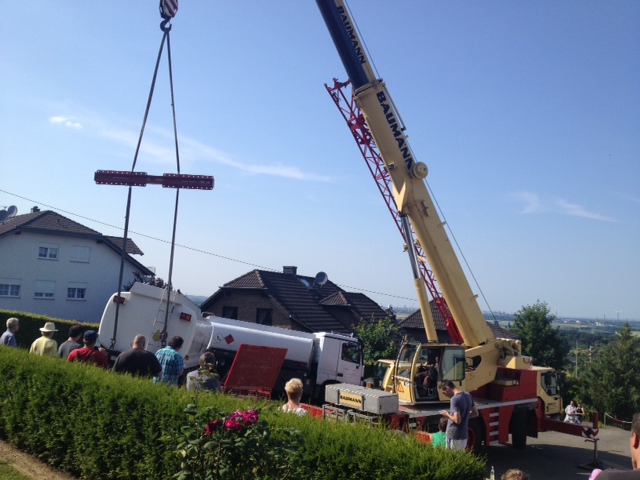 Um den Anhänger wieder auf die Straße zu heben wurde ein Kran angefordert. Zuerst musste aber das Heizöl abgepummt werden, dass von einem zweiter Tanklaster erledigte.