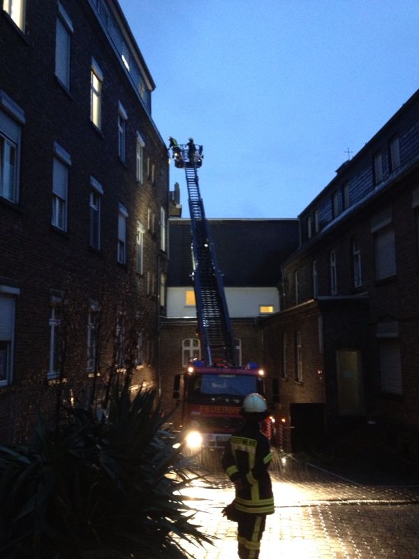 Zur Kontrolle der Dacheinläufe und Regenfallrohre im betroffenen Bereich wurde die Drehleiter sowie ein weiterer Wassersauger der Löschgruppe Bornheim nachgefordert. Nachdem die Drehleiter in Stellung gebracht wurde, konnte vom Korb aus der Ablauf der Dachrinne freigelegt werden und das gesammelte Wasser ablaufen.