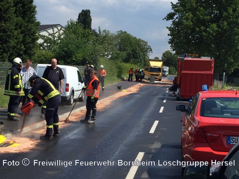 Am Donnerstag den 14.07.2016 um 13:14 Uhr, wurde die Löschgruppe Hersel sowie der Tagesalarm Bornheim, in die Elbestraße gerufen. Dort verlor ein grade vollgetankter LKW seinen Tank und ca. 180 Liter Diesel ergossen sich über die Fahrbahn.