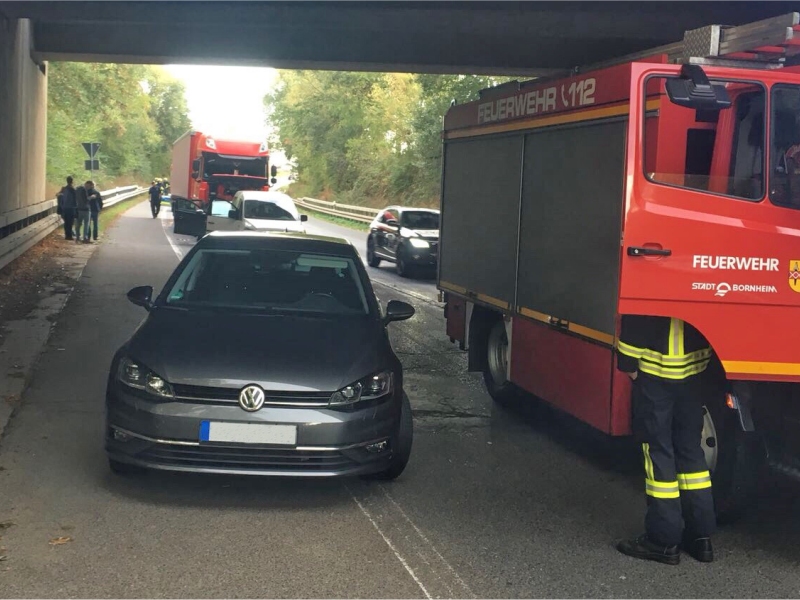 Am Montag, den 24. September 2018, um 17:47 Uhr wurde die Löschgruppe Bornheim auf die L192 kurz hinter der Kreuzung am Hellenkreuz gerufen. Dort hatte ein LKW-Fahrer vermutlich den Rückstau der Kreuzung nicht bemerkt und hatte drei PKW zusammen geschoben. Die Polizei hatte die Feuerwehr gerufen weil aus dem LKW eine Flüssigkeit auslief. Vor Ort konnte der Einsatz aber direkt wieder beendet werden, es war nur auslaufende Kühlflüssigkeit