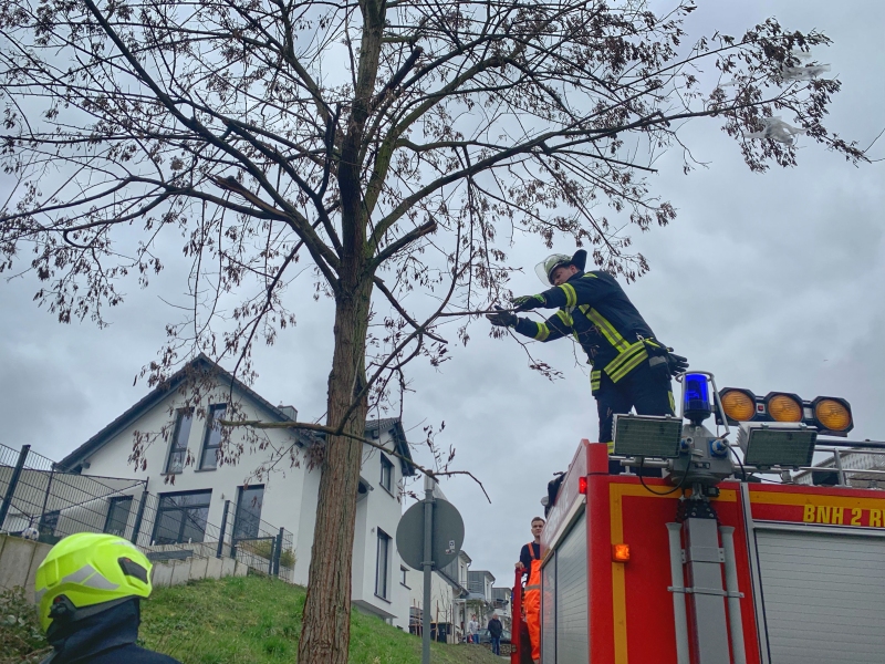 Während des Einsatzes kamen Anwohner auf die Feuerwehr zu und berichteten von einem Ast, an einem Baum an der Einmündung zur Walbottstraße, der ebenfallst kurz davor stand auf die Straße zu fallen. Über den Rüstwagen konnte der Ast bereits abgezogen werden und so die Gefahr beseitigt werden.